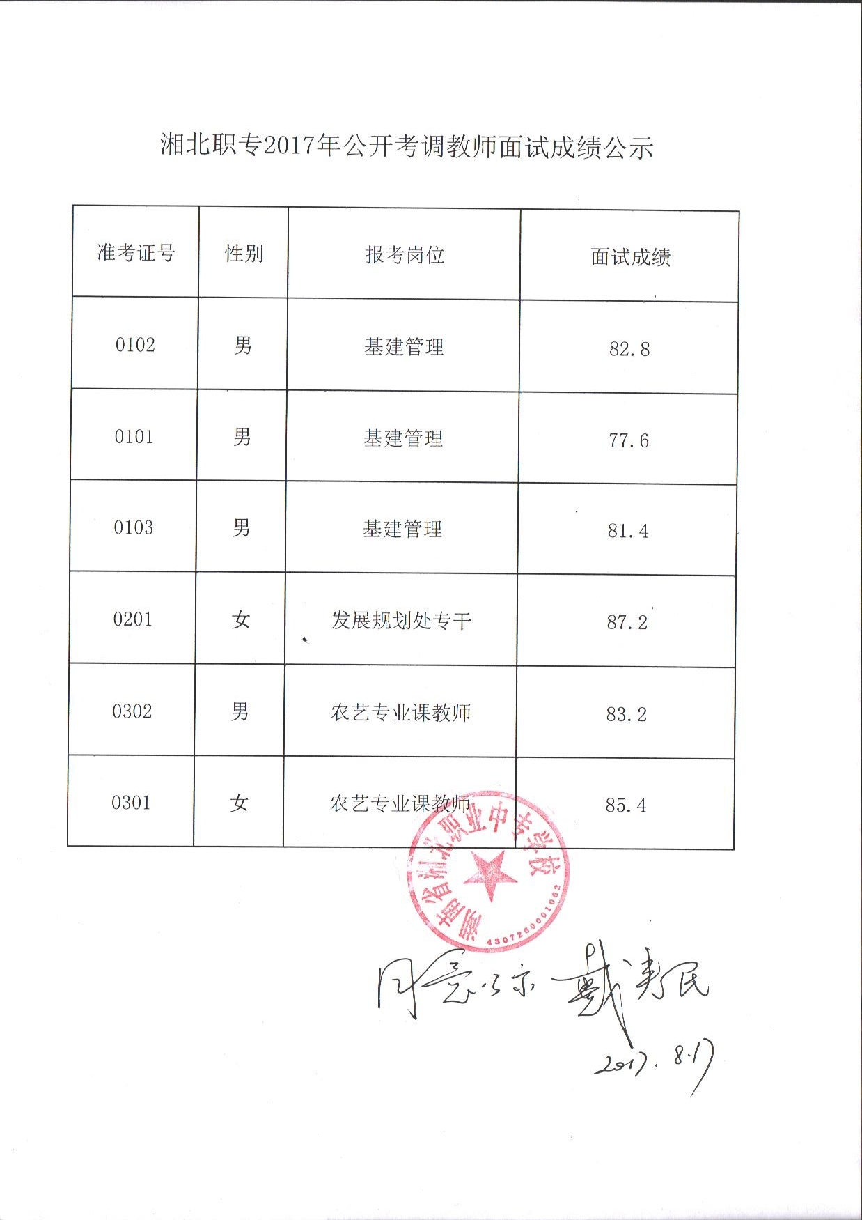 湘北职专2017年公开考调教师面试成绩公示