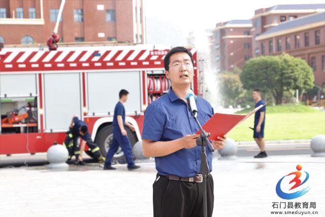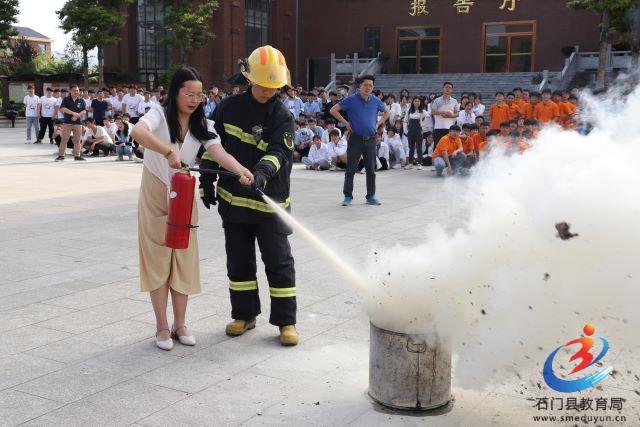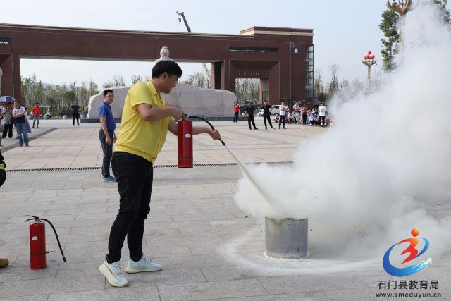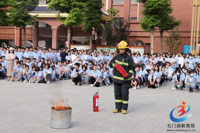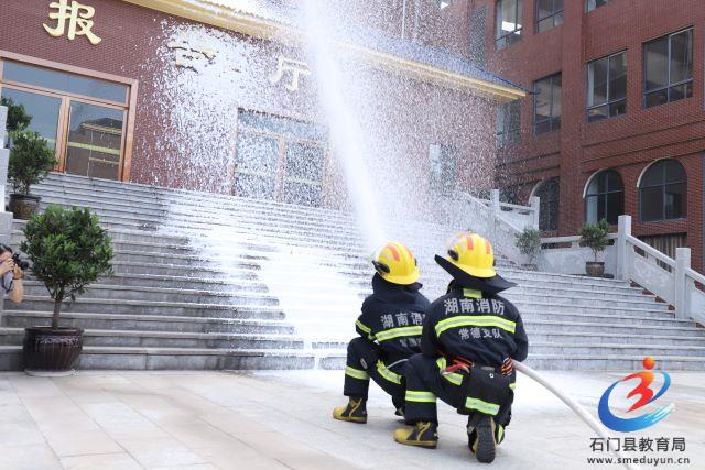 在广场上,学校邀请了湖南消防常德支队石门县消防中队的教官进行灭火技能展示和消防知识宣传。消防队员们现场讲解并演示了灭火器的正确使用,学校教职工和学生也参与了现场灭火练习。随后进行了楼层灭火演练。消防队员们专业、熟练的操作不怕苦不怕累的精神引发了现场师生的一片掌声。