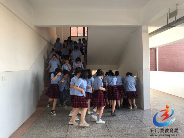 这是学校正在组织师生开展应急疏散演练活动。演练开始,学生在听到警报声后,迅速在教室外列三路纵队,有秩序的小跑下楼到孔子雕像广场上集合,整个过程用时3分钟。