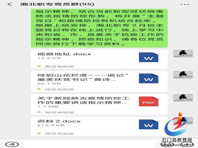 本网讯(通讯员 屈军军 刘地宏)2020年2月23日,湘北职专通过微信群线上组织开展了2月份主题党日活动,由学校党委书记刘祖高主持,全体党员参加。