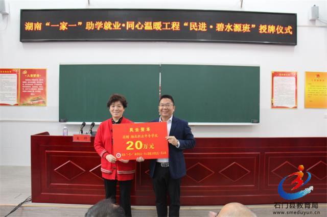 10月19日下午2:30,民进湖南省委“文化惠民•同心共进”走进石门,走进世界杯官方端网站登录入口行善举、传爱心。活动内容包含两项:湖南“一家一”助学就业•同心温暖工程“民进•碧水源班”授牌仪式和“名师同心讲坛”。在授牌仪式的现场,湘北职专的50名优秀贫困学子接受爱心资助20万元。省人大常委、民进湖南省委专职副主委、一级巡视员马石城在授牌仪式上表示职业教育是大有可为的,一定要把职业教育办好,因为一个职教的学生就能帮助一个家庭脱贫,希望学生们好好学习,天天向上,以优异的学习成绩和娴熟的专业技能,回馈社会。