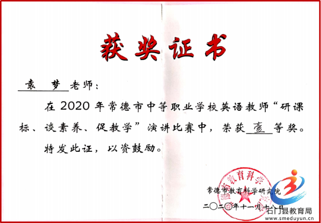 在全市14所参赛学校中,学校袁梦老师、易鑫老师凭借新颖的教学设计和优秀的课堂展现,获得了在场专家及兄弟学校的高度好评。袁梦老师通过自身优良的专业素养及流利激情的演讲,荣获一等奖。易鑫老师的《So much to do before we travel》用丰富的信息化教学手段,活跃的课堂气氛,以文本知识为载体,引导学生尊重各地文化差异,保护环境,取得很好的教学效果。