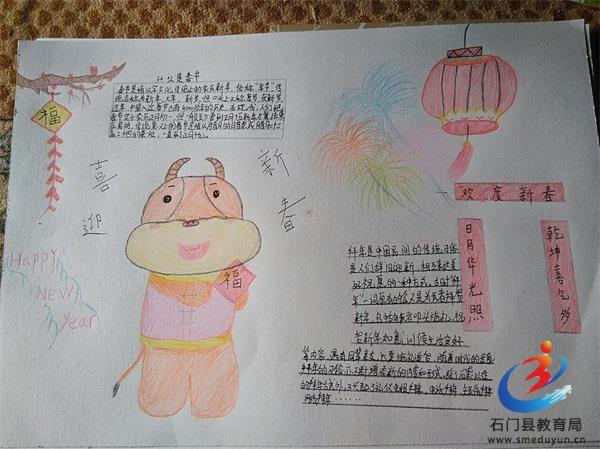 翰墨飘香迎新年。学生通过学习节日文化,搜集节日资料,创作了一份节日小报来展示自己对于这样一个饱含文化历史的传统节日的感悟以及收获。“新春纳福•文化拜年”拜年是中国民间的传统习俗,是人们辞旧迎新、相互表达美好祝愿的一种方式。由于疫情防控的要求,学生采取了微信拜年、发送祝福短信、录制拜年视频等方式给自己的长辈以及亲朋好友送去了节日祝福。 “和谐大家庭•最美幸福年”在浓厚的节日氛围的烘托下大街小巷张灯结彩,家家户户团团圆圆热闹非凡,学生通过手机将自己觉得最为幸福喜庆温暖。的一幕定格了下来。